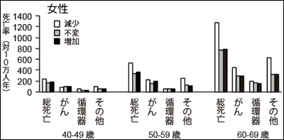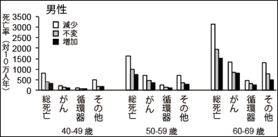 総死亡、がん、循環器疾患死亡率との関連を調べた結果。